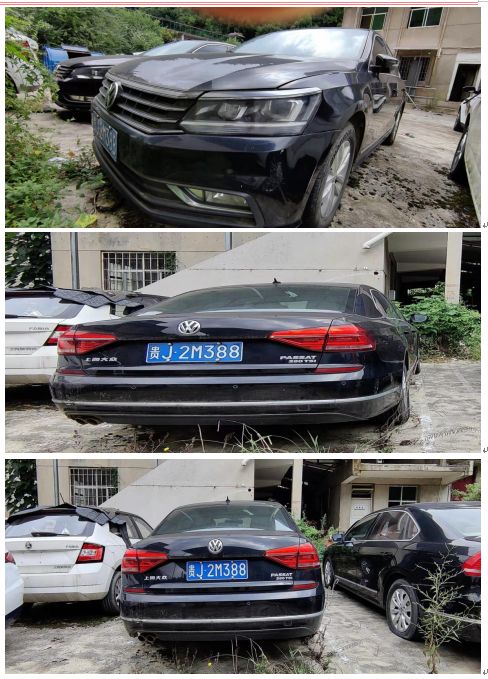 車輛原號牌為“貴J2M388”的大眾汽車牌SVW71410BL型帕薩特小型汽車,因停放時間較長,無法啟動,無法查看儀表數(shù)據(jù),車輛外觀積灰較多, |