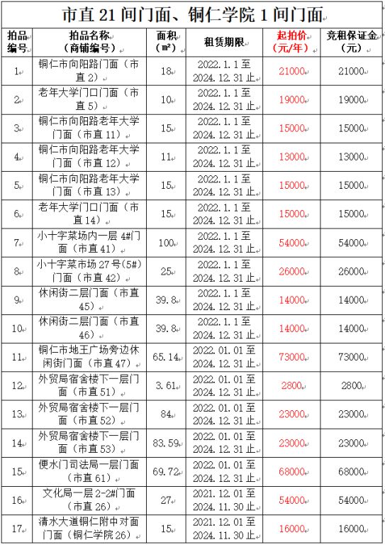 受委托,我公司定于2021年10月27日(星期三)下午14:30時,在銅仁市碧江區(qū)川硐教育園區(qū)誠信路銅仁市公共資源交易中心開標六室(拍賣大廳)公開拍賣以下位于銅仁市的標的租賃權(quán):