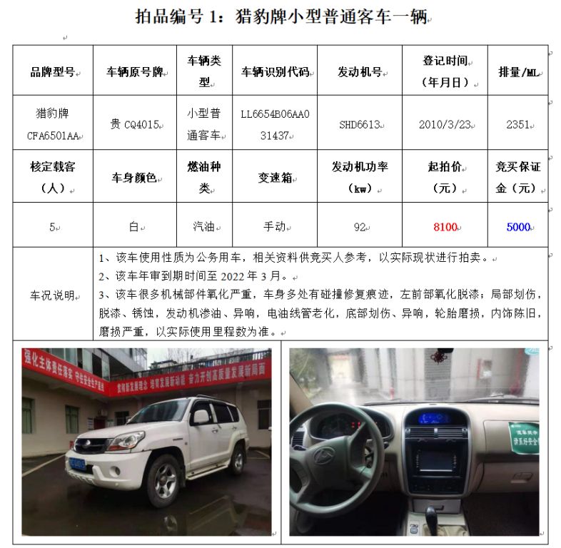獵豹牌CFA6501AA小型普通客車1輛、江淮牌HFC6470A4R3BE3小型普通客車1輛、上匯SH6492中型普通客車1輛,別克牌SGM6529ATA小型普通客車1輛,蒙迪歐牌CAF7230A小型轎車1輛,共計(jì)5輛。