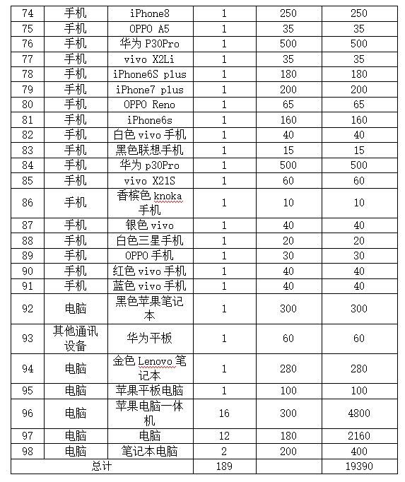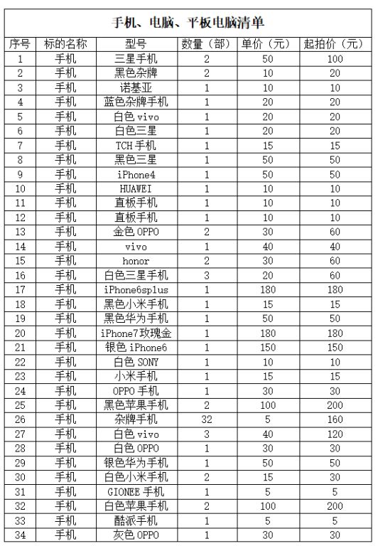 該批標(biāo)的包含各類品牌手機(jī)155部、電腦33臺(tái)、平板電腦1臺(tái)。(詳見后附手機(jī)、電腦、平板電腦清單),該批手機(jī)、電腦、平板電腦因長(zhǎng)期閑置,存在電池?zé)o電,無(wú)法開機(jī)等影響使用的情況。