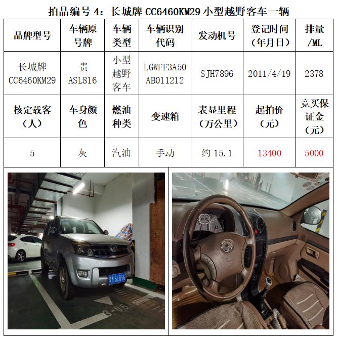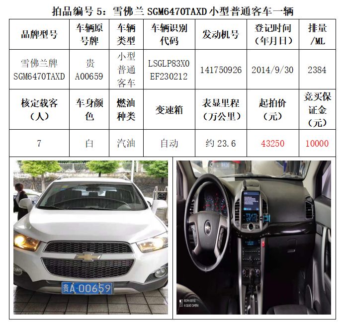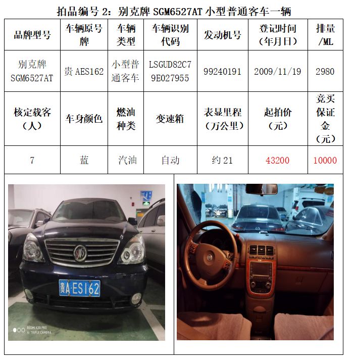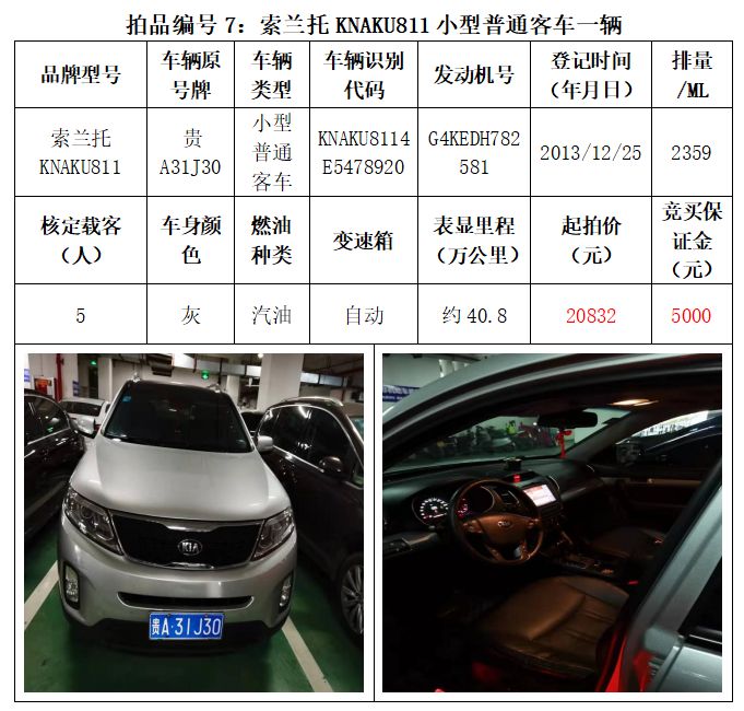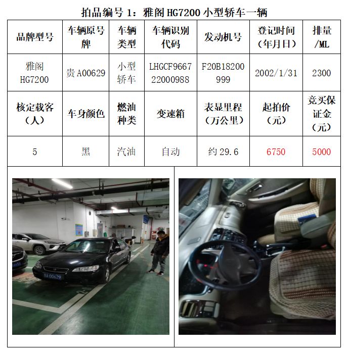 一、拍賣標(biāo)的:雅閣HG7200小型轎車1輛、別克牌SGM6527AT小型普通客車1輛、途勝KMHJN81D95U小型越野客車1輛、長城牌CC6460KM29小型越野客車1輛、雪佛蘭SGM6470TAXD小型普通客車1輛、尼桑牌ZN6453WAG3小型普通客車1輛,索蘭托KNAKU811小型普通客車1輛,共計(jì)7輛車。
