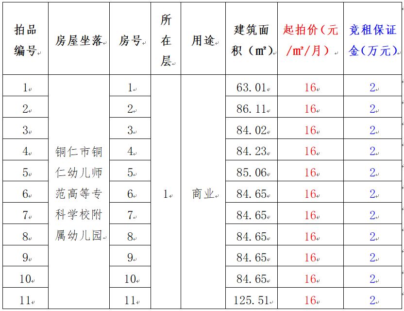 1、銅仁幼兒師范高等??茖W(xué)校附屬幼兒園一層1至11號商業(yè)房地產(chǎn)11間門面拍租,建筑面積:63.01㎡-125.51㎡,拍租經(jīng)營期限:5年,起拍價:16元/㎡/月;