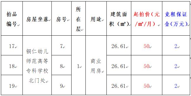 3、銅仁市銅仁幼兒師范高等??茖W(xué)校北門處7至9號商業(yè)房地產(chǎn)3間門面拍租,建筑面積:26.61㎡,拍租經(jīng)營期限:5年。起拍價:50元/㎡/月。