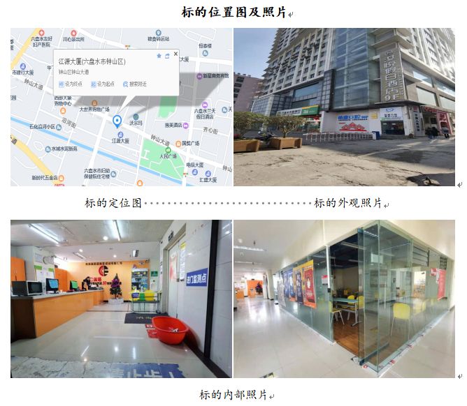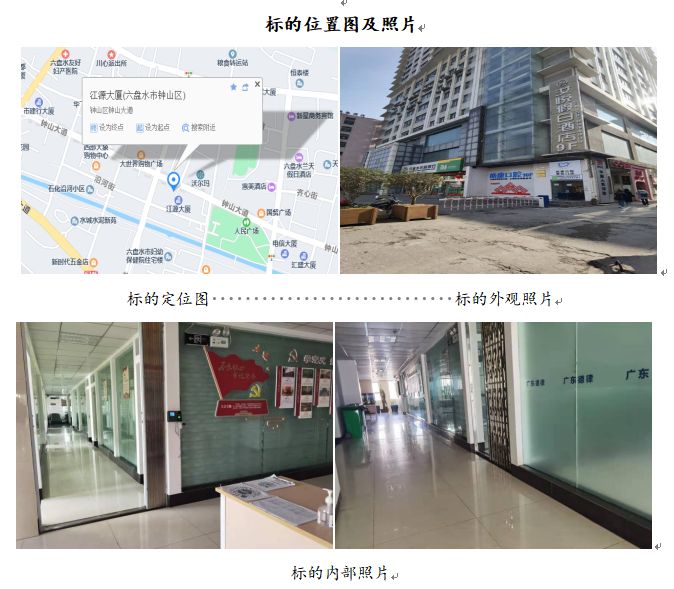 標(biāo)的位于六盤水市鐘山區(qū)鐘山中路江源大廈46號6層601室的商業(yè)房地產(chǎn),建筑面積為1181.04㎡,樓幢總層數(shù)為27層,所在樓憧為鋼筋混凝土結(jié)構(gòu),建成于2010年。