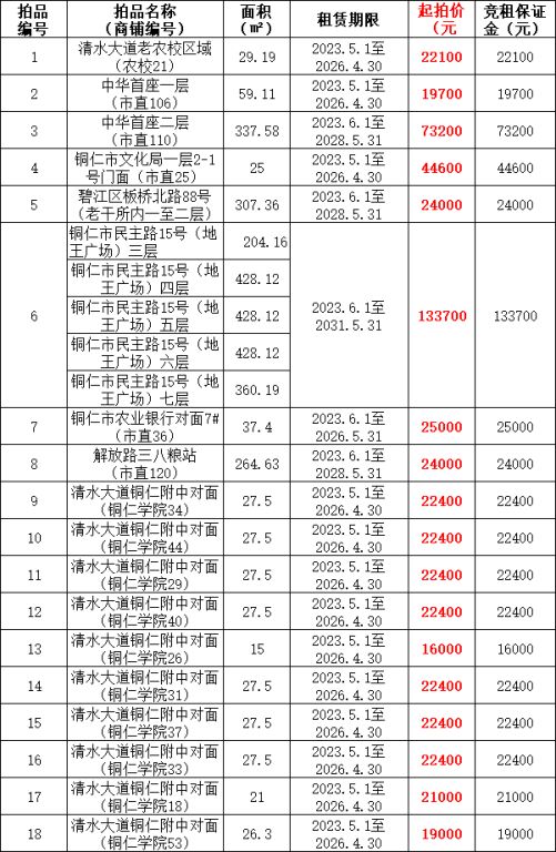 拍品14號至16號標(biāo)的:位于清水大道銅仁附中對面,面積均為:27.5㎡,租賃期均為3年(2023.5.1至2026.4.30),附近有車站、醫(yī)院、銀行、酒店、超市、學(xué)校等,交通便利,人流量大。