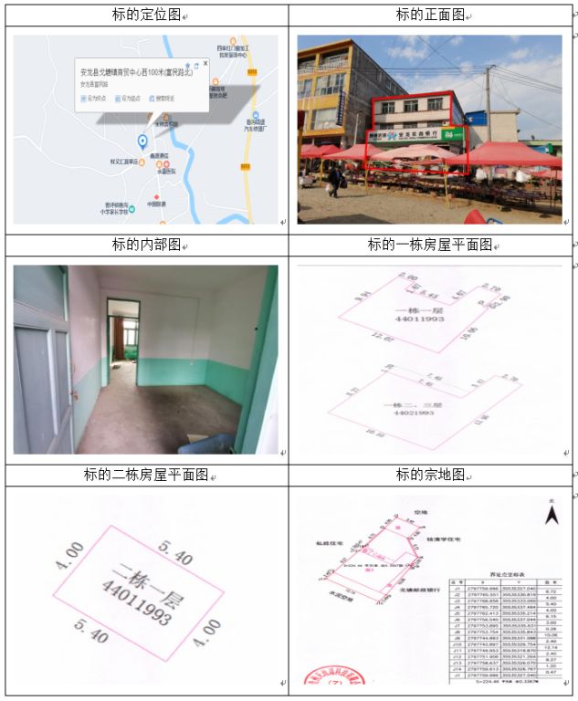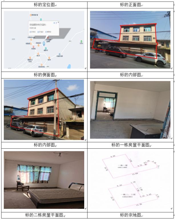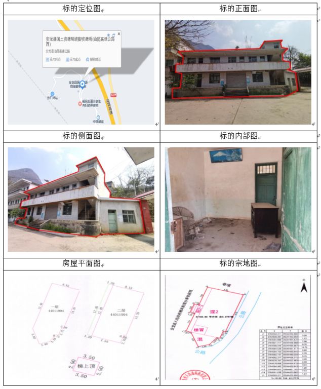 標的坐落于安龍縣錢相鄉(xiāng)政府門口,房屋總層數(shù)3層,實測建筑總面積:329.68㎡,其中1幢1-3層證載建筑面積:327.37㎡,2幢1層證載建筑面積:61.22㎡,房屋產(chǎn)權(quán)證號:安國用(2014)第17號,房屋產(chǎn)權(quán)證號:安房權(quán)證錢相鎮(zhèn)字第00003467號,設(shè)計用途分別為辦公住宅、其它,混合結(jié)構(gòu);證載土地使用權(quán)面積:276.62㎡,實測土地使用權(quán)面積252.31㎡,地類(用途)金融用地,使用權(quán)類型為出讓,終止日期為2054年11月22日止。