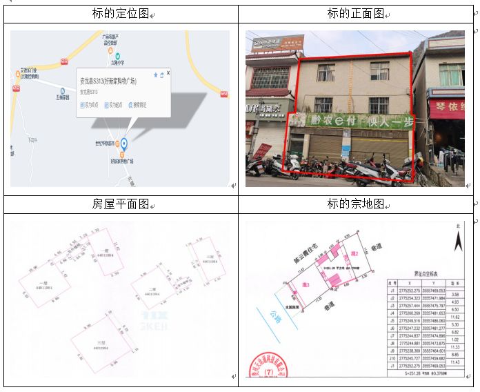 標的坐落于安龍縣興隆鎮(zhèn)當(dāng)朝村狗廠組,房屋總層數(shù)3層,其中1幢1-3層證載建筑面積:297.04㎡,2幢1層證載建筑面積:3.8㎡,3幢1層證載建筑面積:48.29㎡,房屋產(chǎn)權(quán)證號:安房權(quán)證興隆鎮(zhèn)字第00003465號,設(shè)計用途分別為辦公住宅、住宅,混合結(jié)構(gòu);土地使用權(quán)證號:安國用(2014)第13號,證載土地使用權(quán)面積:251.3㎡,實測土地使用權(quán)面積251.28㎡,地類(用途)金融用地,使用權(quán)類型為出讓,終止日期為2054年11月22日止。