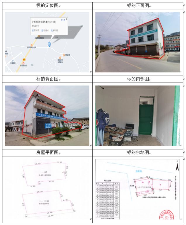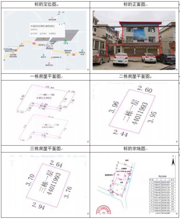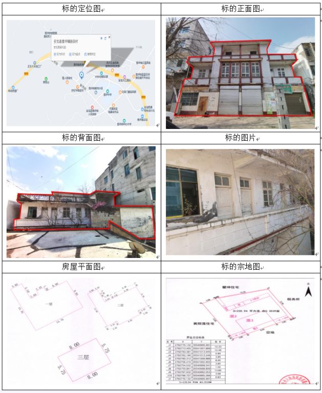 標的坐落于安龍縣新橋鎮(zhèn)新橋居委會,房屋總層數(shù)3層,其中1幢1-3層證載建筑面積:312.26㎡,實測建筑面積:338.52㎡,2幢1層證載建筑面積:10.81㎡,實測建筑面積:9㎡,3幢1層證載建筑面積:9.72㎡,實測建筑面積:10.42㎡,房屋產(chǎn)權(quán)證號:安房權(quán)證新橋鎮(zhèn)字第00003462號,設(shè)計用途分別為辦公住宅、其它,混合結(jié)構(gòu);土地使用權(quán)證號:安國用(2014)第20號,證載土地使用權(quán)面積:443.24㎡,實測土地使用權(quán)面積443.24㎡,地類(用途)金融用地,使用權(quán)類型為出讓,終止日期為2054年11月22日止。