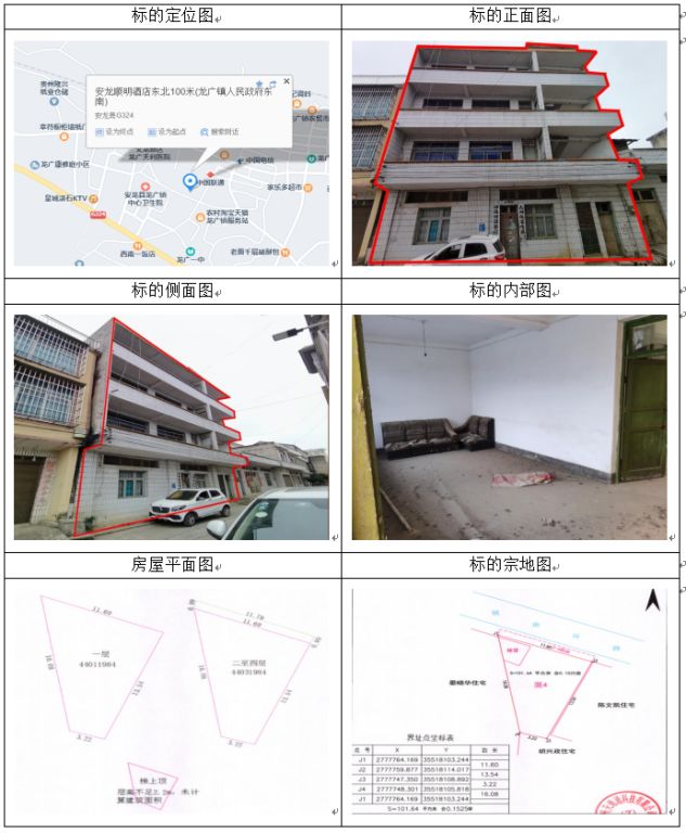 標的坐落于安龍縣龍廣鎮(zhèn)南環(huán)路,房屋總層數(shù)4層,證載建筑面積:453.34㎡,實測建筑面積:423.42㎡,房屋產(chǎn)權(quán)證號:安房權(quán)證龍廣鎮(zhèn)字第00003464號,設(shè)計用途為住宅,混合結(jié)構(gòu);土地使用權(quán)證號:安國用(2014)第11號,證載土地使用權(quán)面積:98.7㎡,實測土地使用權(quán)面積:101.64㎡,地類(用途)住宅用地,使用權(quán)類型為出讓,終止日期為2054年11月22日止。