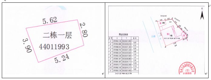 6、龍廣鎮(zhèn)南環(huán)路房地產(chǎn)(原龍廣信用社),證載建筑面積:453.34㎡,實測建筑面積:423.42㎡;證載土地使用權(quán)面積:98.7㎡,實測土地使用權(quán)面積:101.64㎡;