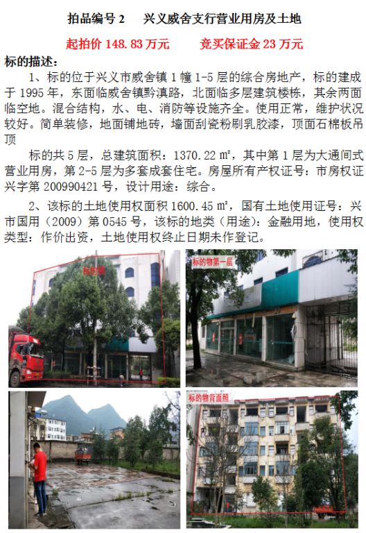 二、興義威舍支行營業(yè)用房及土地,建筑面積1370.22㎡;