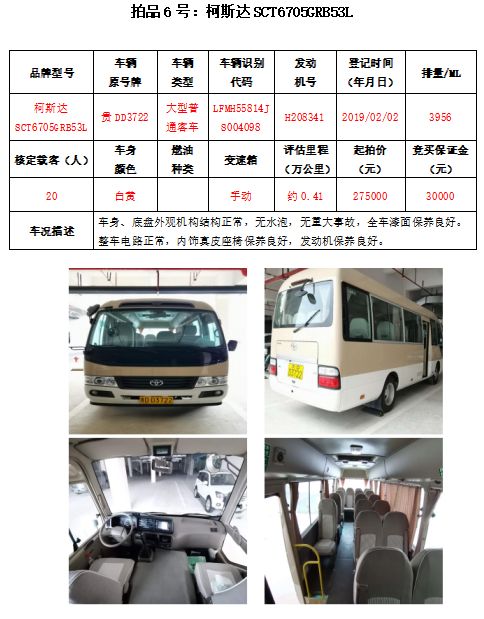 受銅仁北站客運(yùn)有限公司委托,本公司定于2020年11月27日(星期五)下午14:30時,在銅仁市碧江區(qū)川硐教育園區(qū)誠信路銅仁市公共資源交易中心開標(biāo)六室(拍賣大廳)公開拍賣:長城哈弗(越野車4輛)、路虎發(fā)現(xiàn)(越野車1輛)、柯斯達(dá)(大型普通客車1輛)共計(jì)6輛車。