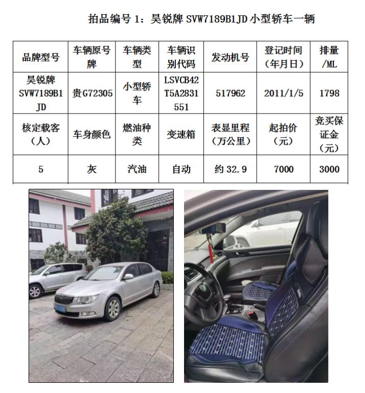 受委托,我公司定于2020年12月4日(星期五)下午14:30在安順市西秀區(qū)黃果樹大街345號(hào)黔中大廈安順農(nóng)行三樓會(huì)議室公開(kāi)拍賣:昊銳牌、帕薩特牌(兩輛)、別克牌共計(jì)4輛車。