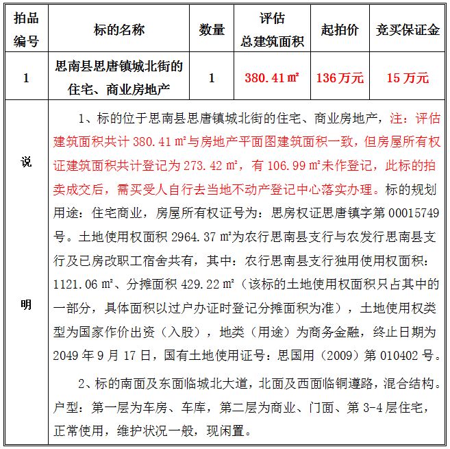 1、思南縣思唐鎮(zhèn)城北街的住宅、商業(yè)房地產(chǎn),建筑面積共:380.41㎡;起拍價(jià):136萬(wàn)元;競(jìng)買(mǎi)保證金15萬(wàn)元。