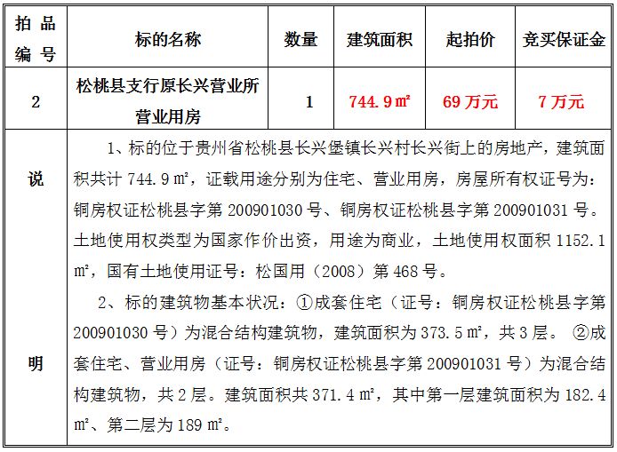 2、松桃縣支行原長(zhǎng)興營(yíng)業(yè)所營(yíng)業(yè)用房,建筑面積共:744.9㎡;起拍價(jià):69萬(wàn)元;競(jìng)買(mǎi)保證金:7萬(wàn)元