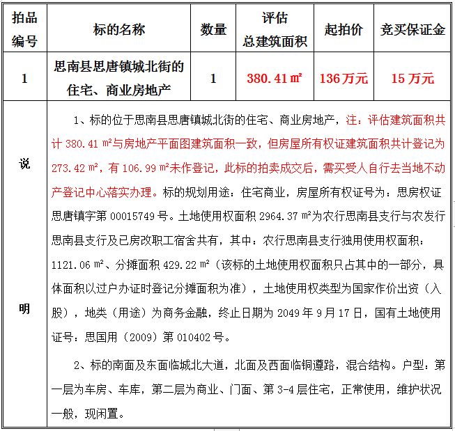 1、思南縣思唐鎮(zhèn)城北街的住宅、商業(yè)房地產(chǎn),建筑面積共:380.41㎡;起拍價:136萬元;競買保證金15萬元。