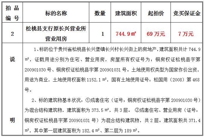 2、松桃縣支行原長興營業(yè)所營業(yè)用房,建筑面積共:744.9㎡;起拍價:69萬元;競買保證金:7萬元。