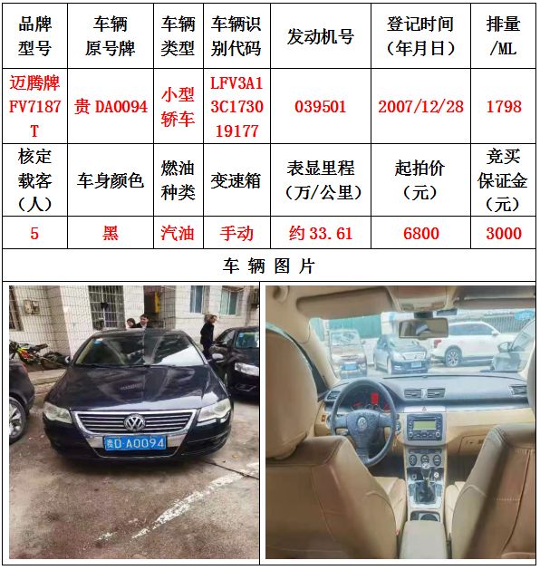 本次拍賣會的拍賣標的其中5輛車,分別為邁騰牌FV7187T小型轎車一輛、豐田牌GTM7200GB-NAV1小型轎車一輛、捷達牌FV7160GiF E3小型轎車一輛、帕薩特牌SVW7203FPi小型轎車一輛、帕薩特牌SVW7203FPi小型轎車一輛,為打包整體拍賣,不作拆分,整體起拍價:42400元,且只對標的現(xiàn)狀進行拍賣,不作任何質(zhì)量擔保。