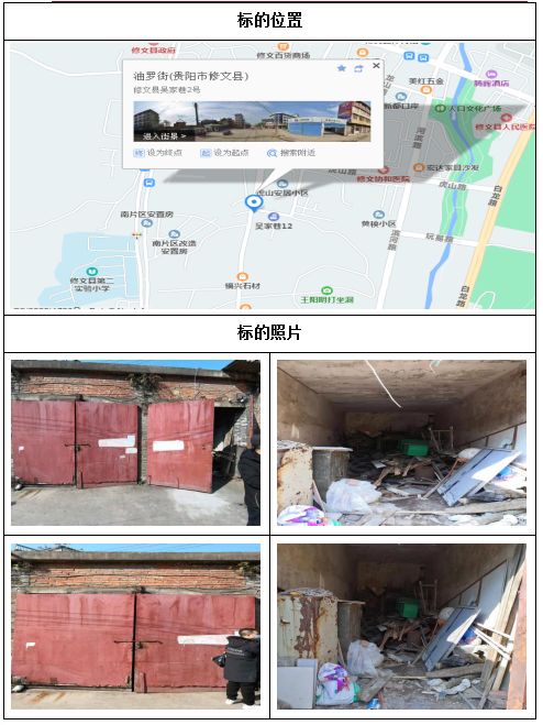標(biāo)的位于修文縣人民南路工行洗腳塘宿舍,建筑面積為30㎡,共兩個獨(dú)立車庫。該標(biāo)的東至人民南路,南至小區(qū)道路,西至小區(qū)道路,北至小區(qū)道路;建筑結(jié)構(gòu)為磚混結(jié)構(gòu),層高約3米,無物業(yè)管理,戶型結(jié)構(gòu)為開間。