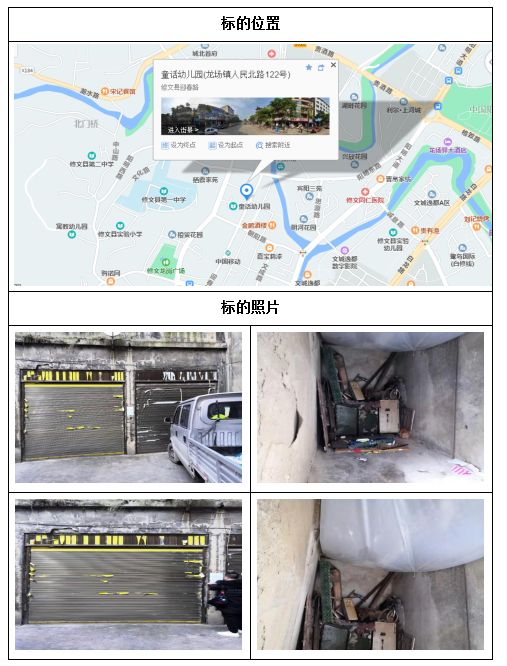 標(biāo)的位于修文縣龍場鎮(zhèn)迎春路52號,建筑面積為30㎡,共兩個獨(dú)立車庫。實(shí)際用途為車庫,該標(biāo)的東至迎春路,南至小區(qū)道路,西至小區(qū)道路,北至小區(qū)道路;建筑結(jié)構(gòu)為磚混結(jié)構(gòu),層高約3米,無物業(yè)管理,戶型結(jié)構(gòu)為開間。