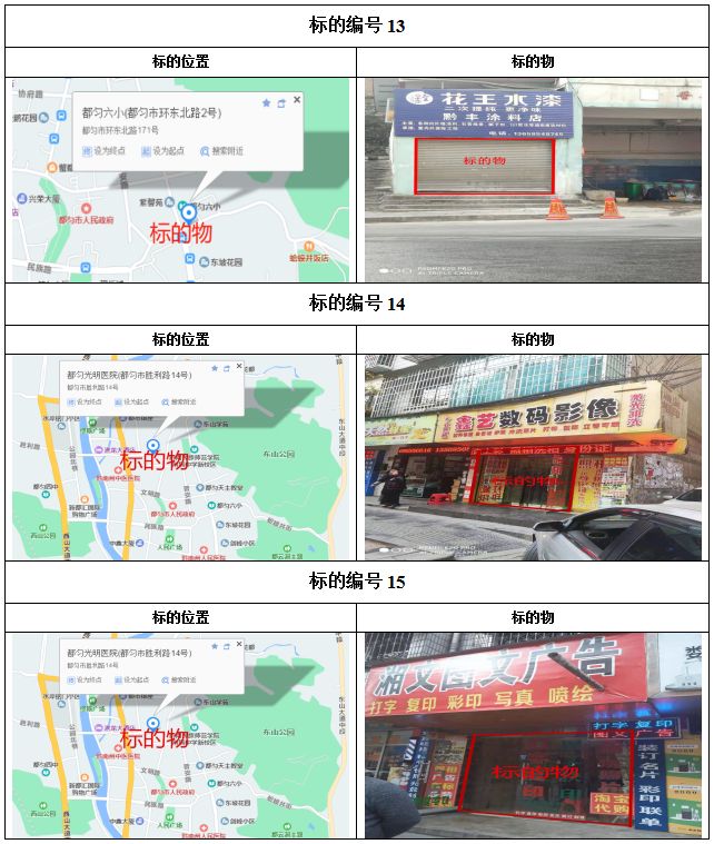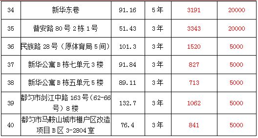 2、都勻市大十字三角巷、西苑小區(qū)、新汽車站對面、新華東巷、新華公寓、劍江中路、馬鞍山城市棚戶區(qū)、石惠公寓等10處房屋3年-5年租賃權,面積約13.27㎡-221.94㎡;