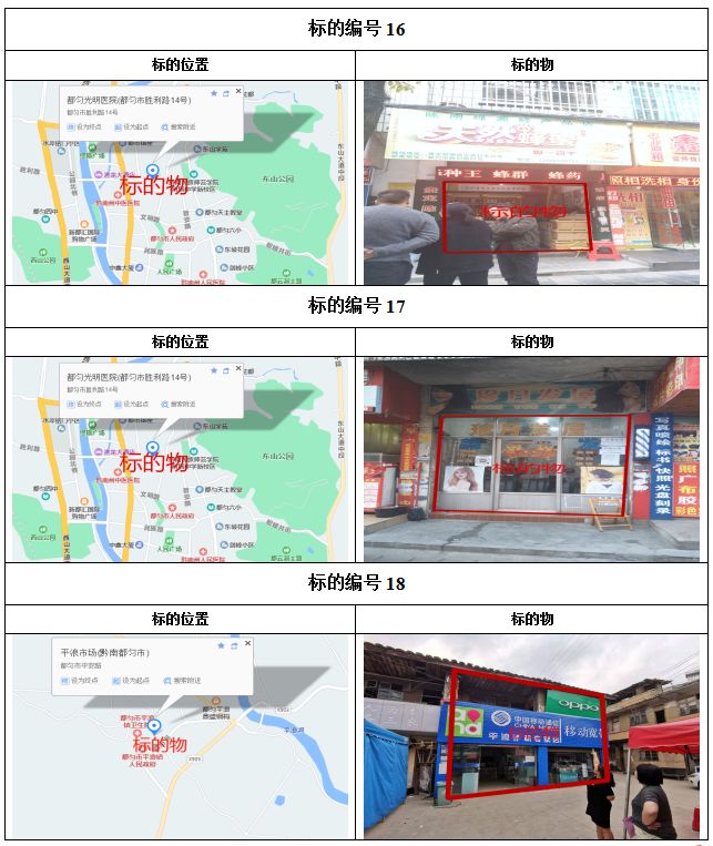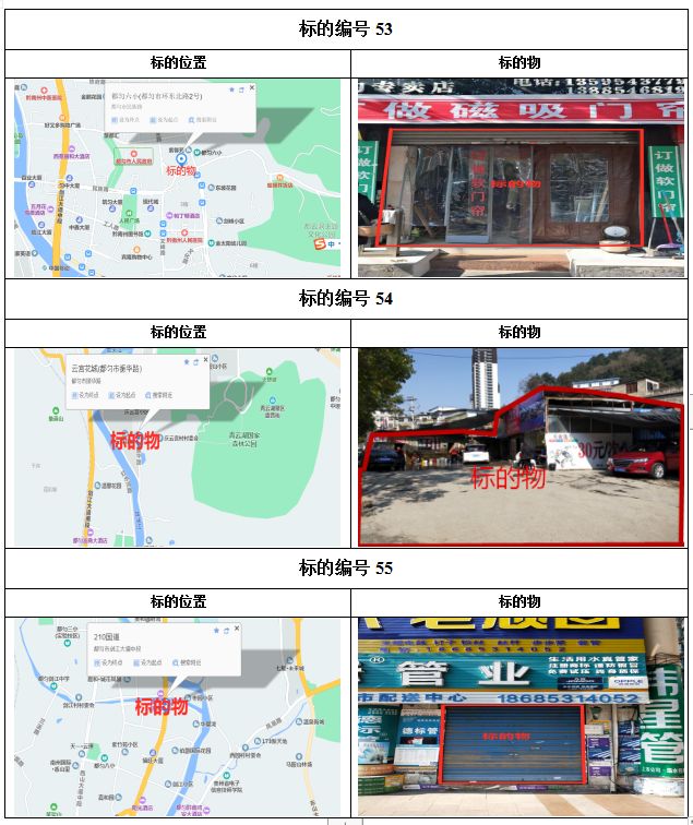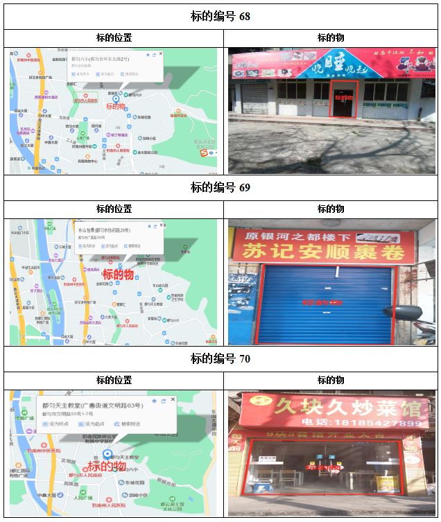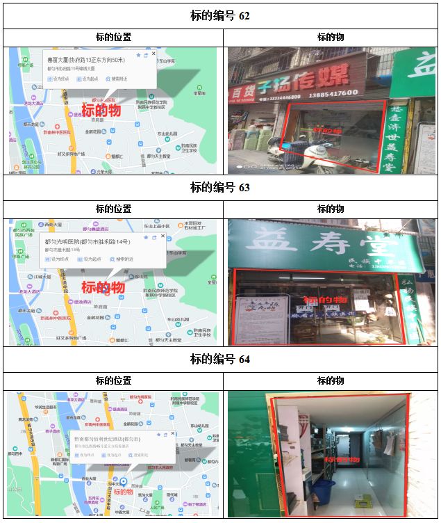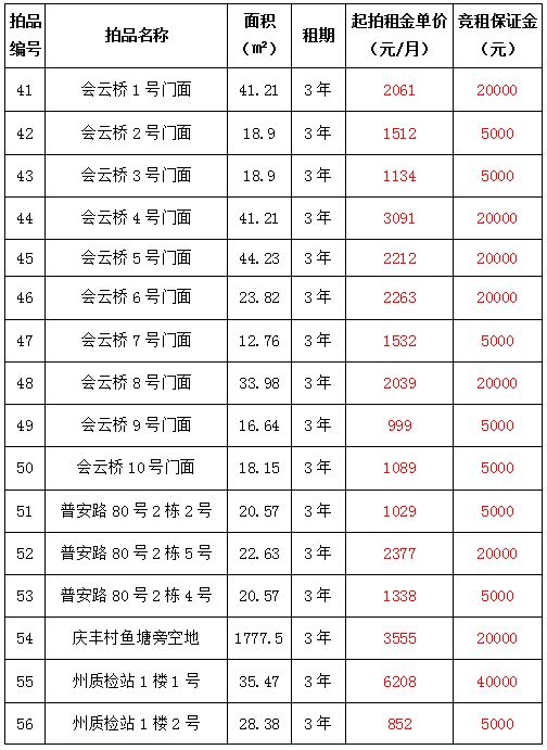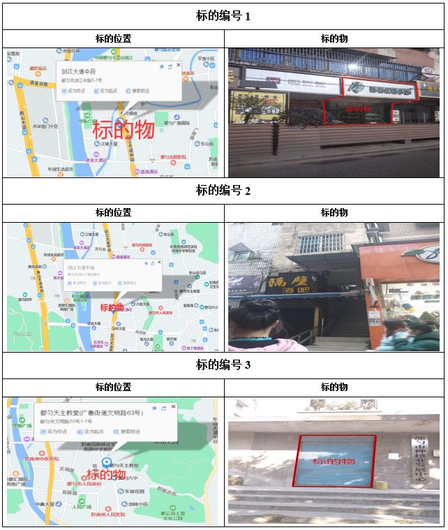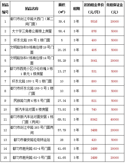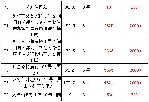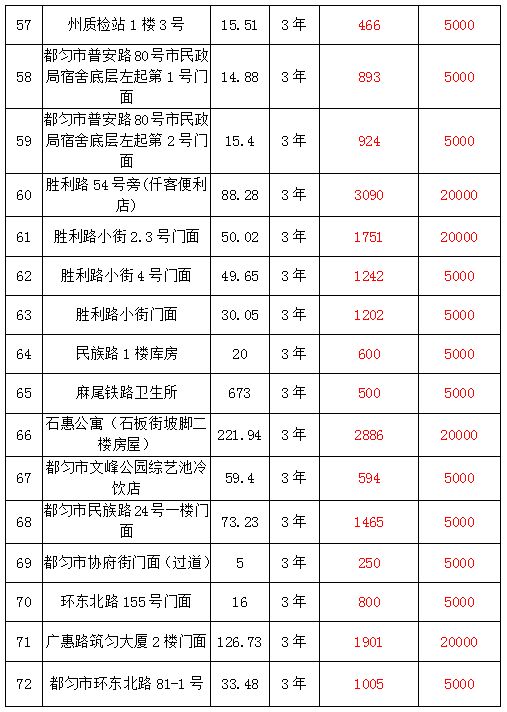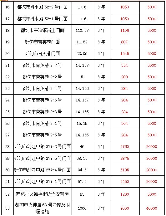 1、都勻市劍江中路、環(huán)東北路、文明路、民族路、勝利路、會云橋、育英巷等62處門面3年租賃權,面積約5㎡-137.74㎡;