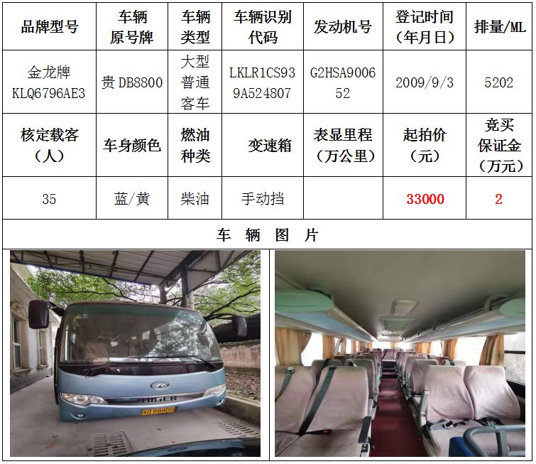 2、金龍牌大型普通客車一輛,起拍價:33000元,競買保證金:2萬元;