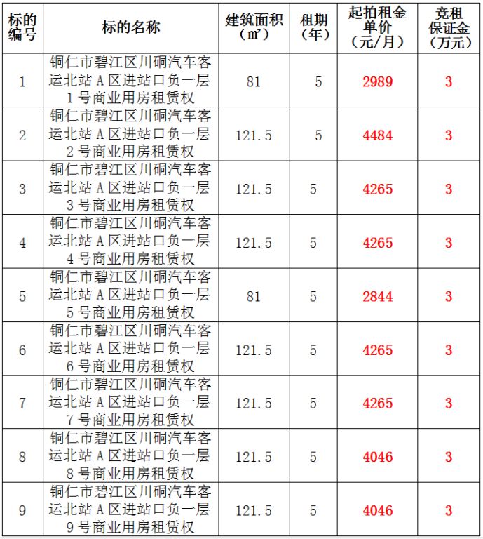 1、銅仁市碧江區(qū)川硐汽車(chē)客運(yùn)北站A區(qū)進(jìn)站口負(fù)一層1號(hào)門(mén)面租賃權(quán),面積:81㎡,租賃期:5年,起拍租金單價(jià):2989元/月,競(jìng)租保證金:3萬(wàn)元;