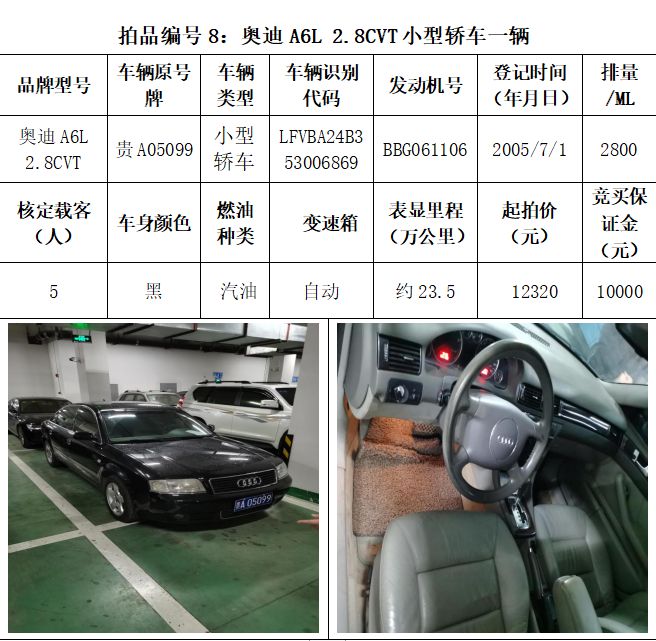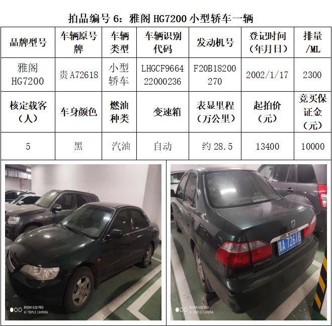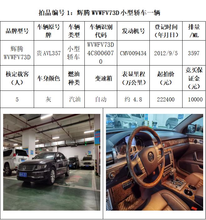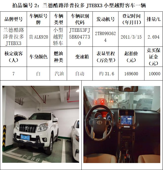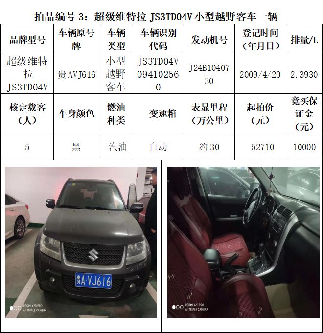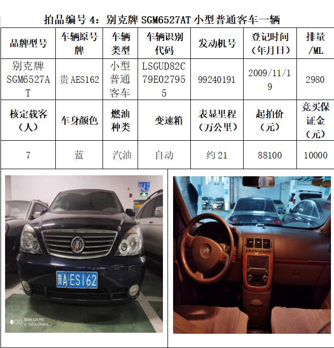 受委托,本公司定于2021年3月26日(星期五)下午14:30時(shí),在貴陽市中華南路20號(hào)新大陸數(shù)碼廣場(chǎng)10樓D座拍賣廳公開拍賣以下車輛:普拉多越野車1輛、超級(jí)維特拉越野車1輛、別克商務(wù)旅行車1輛、輝騰轎車1輛、途勝越野車1輛、雅閣轎車2輛、奧迪轎車1輛,長城牌小型越野客車1輛,共計(jì)9輛車。
