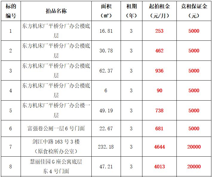 1.本次拍賣標(biāo)的共計(jì)47個(gè),均以現(xiàn)狀出租,其中:1—9號標(biāo)的目前為租賃狀態(tài),如承租人參與競租,其享有同等價(jià)位優(yōu)先承租權(quán),其余標(biāo)的均為閑置狀態(tài)。