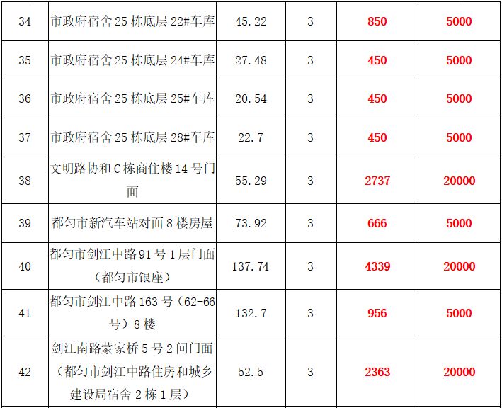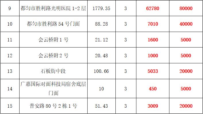 2、都勻市勝利路、劍江中路、劍江南路、富強(qiáng)巷、會云橋、石板街、普安路、七星城6號樓、文明路、蠟紙廠、民族路、大興街等18處門面或辦公用房3年租賃權(quán),面積約9㎡-1779.35㎡;