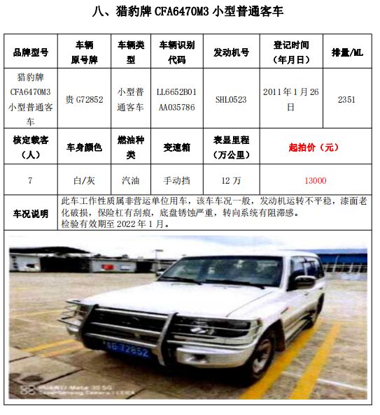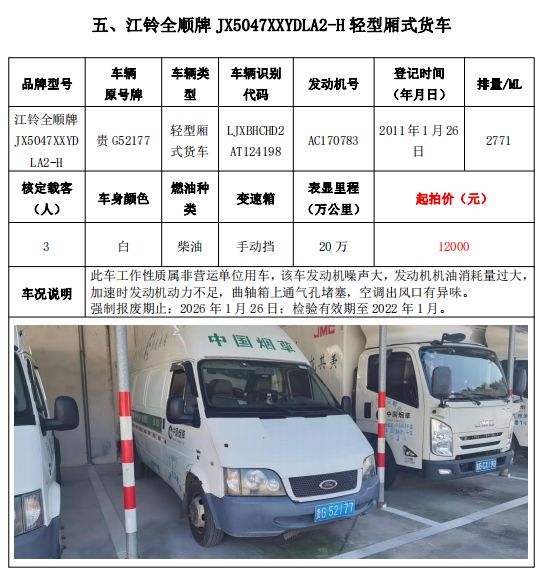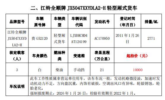 受委托,我公司于2021年12月14日(星期二)下午14:30在貴州省貴陽市中華南路20號新大陸數(shù)碼廣場10樓D座會議室公開拍賣以下標(biāo)的:大通牌SH5041XXYA7D4輕型廂式貨車2輛、大通牌SH5041XXYA6D4輕型廂式貨車1輛、江鈴全順牌JX5047XXYDLA2-H輕型廂式貨車2輛、江鈴全順牌JX5047XFWMD小型專項(xiàng)作業(yè)車1輛、五十鈴牌QL1020UGDSC輕型普通貨車1輛、獵豹牌CFA6470M3小型普通客車1輛、獵豹牌CFA6470LA小型越野客車1輛,共計(jì)9輛車整體拍賣。
