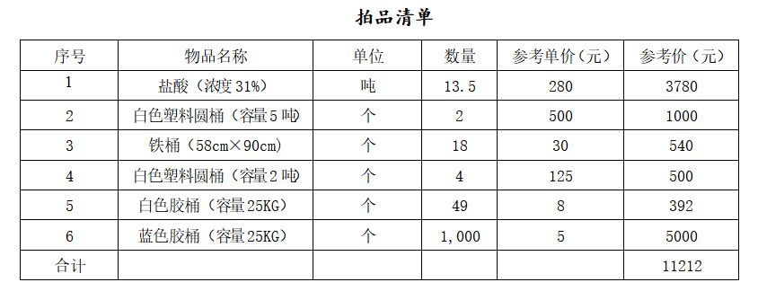 拍品編號(hào)2:貴陽(yáng)市公安局花溪分局收繳鹽酸、鐵桶、橡膠桶、塑料桶等物資一批