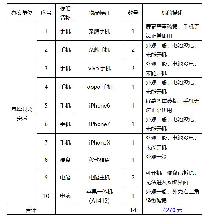 該批標(biāo)的包含各類品牌手機(jī)10部;電腦主機(jī)2臺(tái);蘋果一體機(jī)1臺(tái);移動(dòng)硬盤1個(gè)。