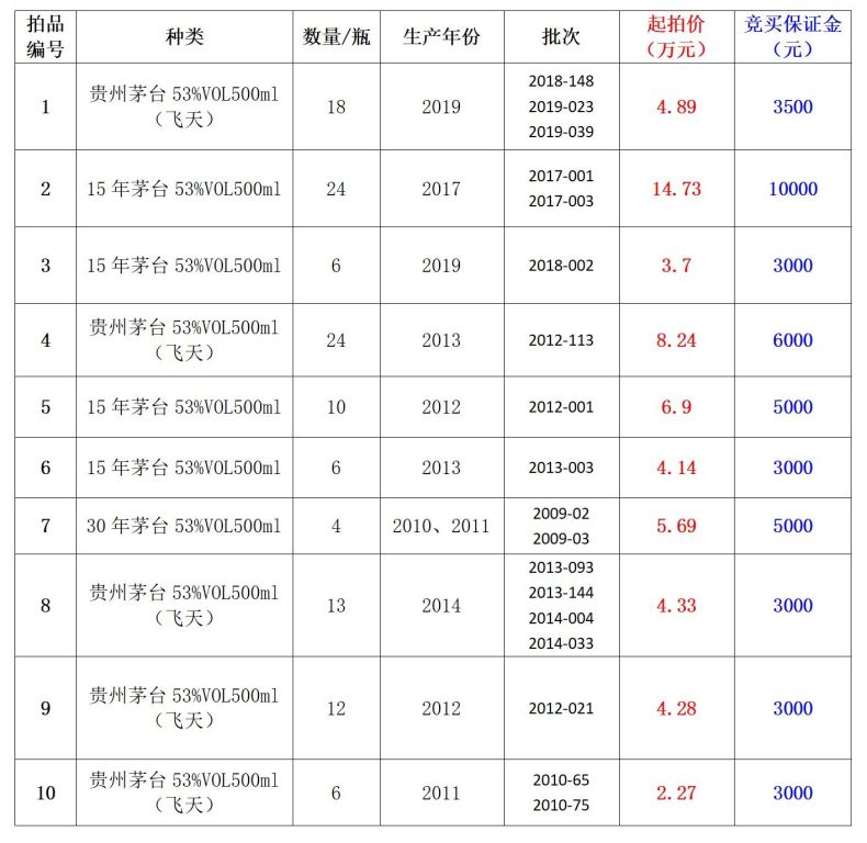 貴州茅臺53%VOL500ml(飛天)、15年茅臺53%VOL500ml、30年茅臺53%VOL500ml等123瓶茅臺酒,分為10個標(biāo)的。
