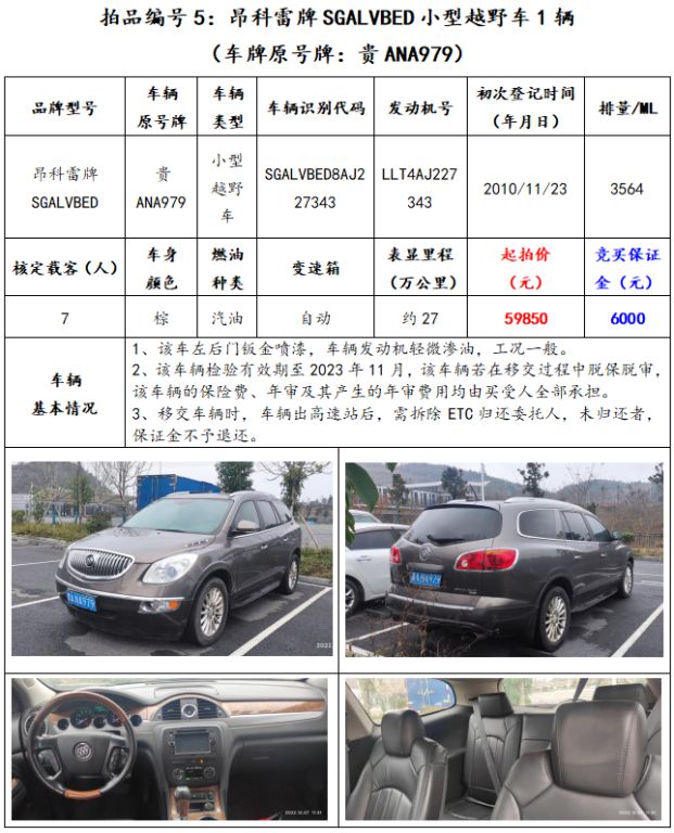 拍品編號5:昂科雷牌SGALVBED小型越野車1輛(車牌原號牌:貴ANA979);