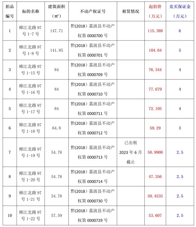 標的位于玉屏鎮(zhèn)民族路2號,房屋建筑面積:627.65㎡,產(chǎn)權(quán)完整,2011年建成,房屋總層數(shù)為14層,標的所在層數(shù)為1層。不動產(chǎn)權(quán)證號:黔房權(quán)證荔波縣字第201300495號,土地所有權(quán)類型:出讓;土地所有權(quán)規(guī)劃用途:商業(yè)用房,建筑結(jié)構(gòu)為鋼混結(jié)構(gòu)。