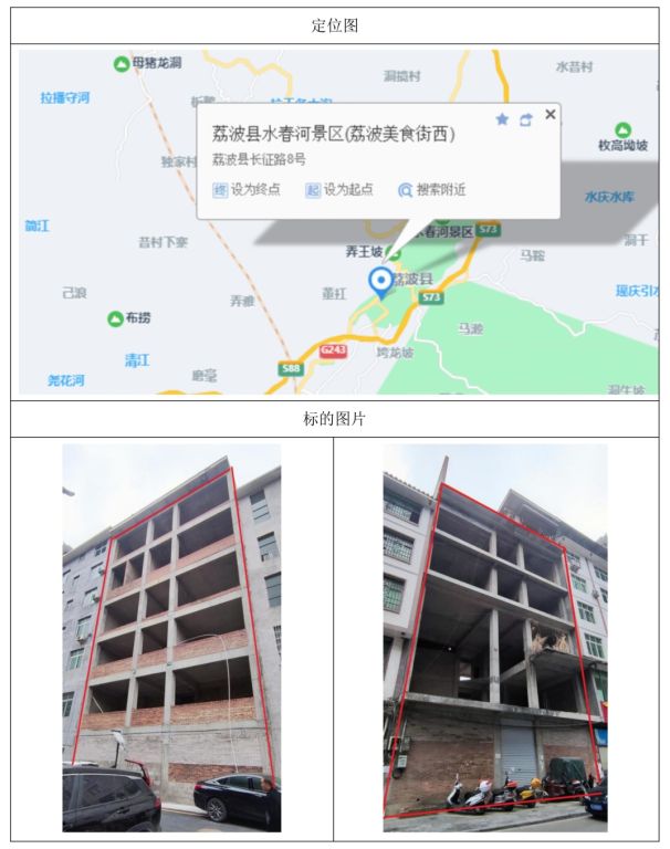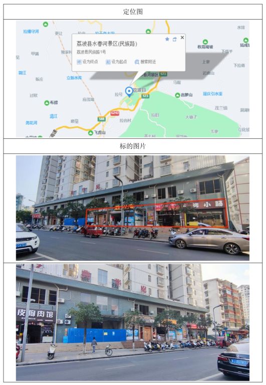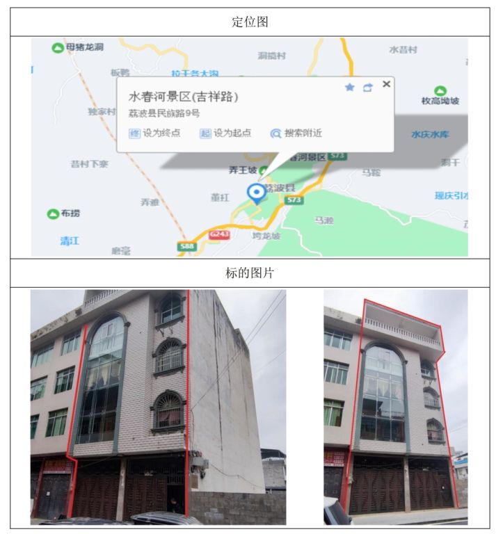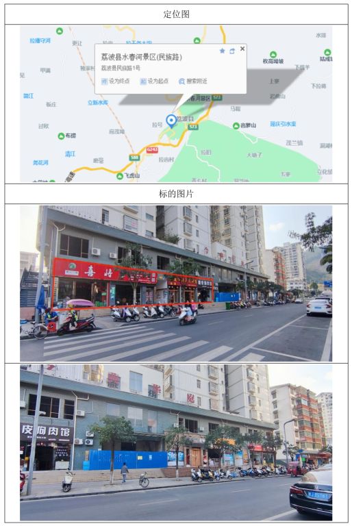 標的位于玉屏鎮(zhèn)民族路2號,房屋建筑面積:907.75㎡,產(chǎn)權(quán)完整,2011年建成,房屋總層數(shù)為14層,標的所在層數(shù)為1層。不動產(chǎn)權(quán)證號:黔房權(quán)證荔波縣字第201300496號,土地所有權(quán)類型:出讓;土地所有權(quán)規(guī)劃用途:商業(yè)用房,建筑結(jié)構(gòu)為鋼混結(jié)構(gòu)。