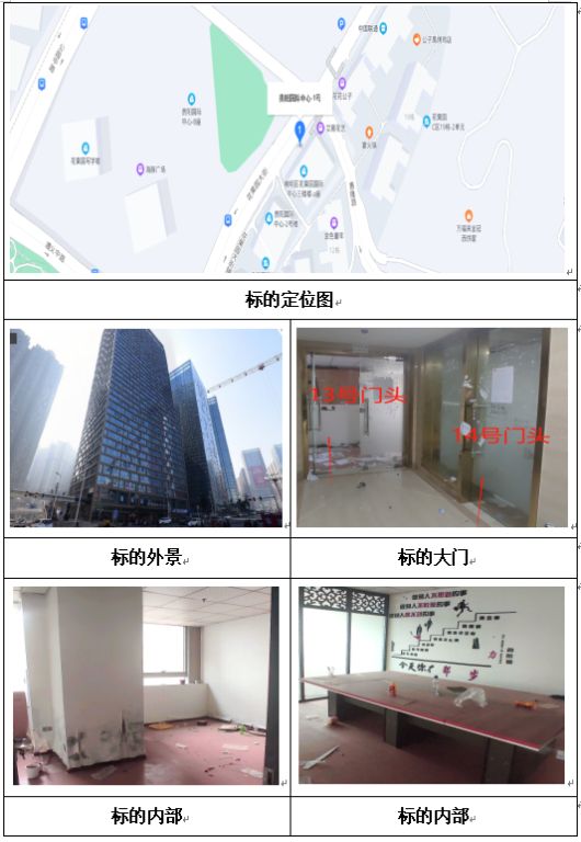 標(biāo)的位于貴陽市南明區(qū)花果園彭家灣花果園C區(qū)(貴陽國(guó)際中心1號(hào))11棟1單元19層13號(hào)、14號(hào)花果園商鋪(商業(yè)寫字樓),其中標(biāo)的2號(hào)建筑面積為99.97㎡、套內(nèi)面積為73.48㎡;標(biāo)的3號(hào)建筑面積為71.26㎡、套內(nèi)面積為52.38㎡。房屋為一般裝修,包含水電敷設(shè)及安裝、地面地磚、墻面刷瓷粉及乳膠漆、頂面鋁扣板吊頂、玻璃門。用途為辦公,鋼混結(jié)構(gòu),建成時(shí)間為2013年8月,所在層數(shù)19層,目前均為空置狀態(tài)。