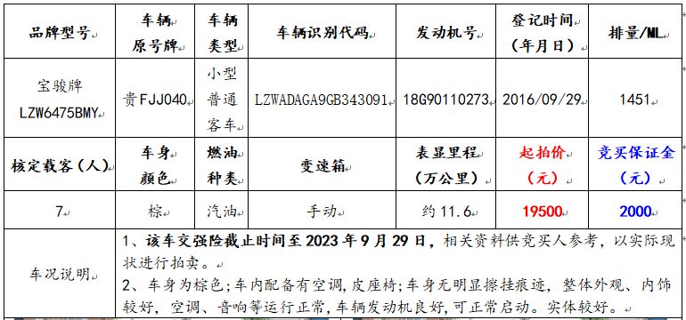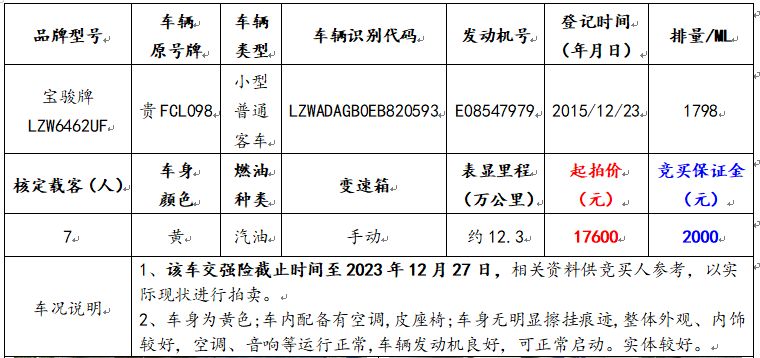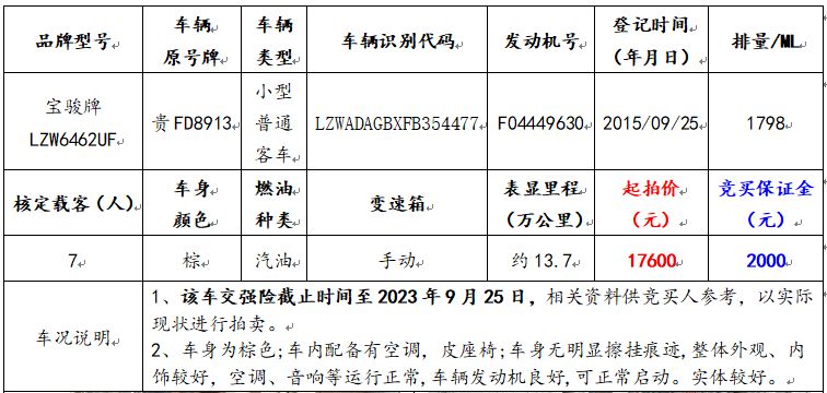 拍品編號(hào)2:寶駿牌LZW6462UF小型普通客車(chē)一輛(車(chē)輛原號(hào)牌:貴FD8913);