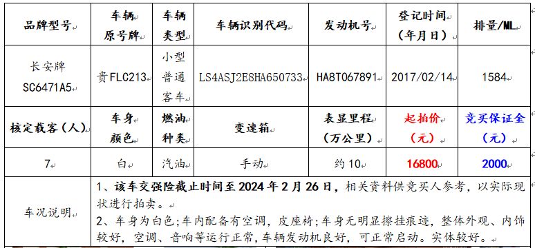 拍品編號(hào)6:長(zhǎng)安牌SC6471A5小型普通客車(chē)一輛(車(chē)輛原號(hào)牌:貴FLC213)。