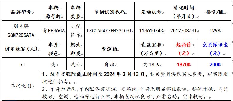 拍品編號(hào)5:別克牌SGM7205ATA小型轎車(chē)一輛(車(chē)輛原號(hào)牌:貴FF3669);