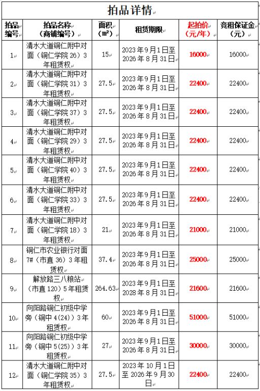 1、清水大道銅仁附中對面(銅仁學院26)3年租賃權,面積:15㎡,租賃期:2023年9月1日至2026年8月31日,起拍價:16000元/年,競租保證金:16000元;