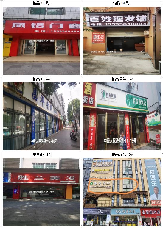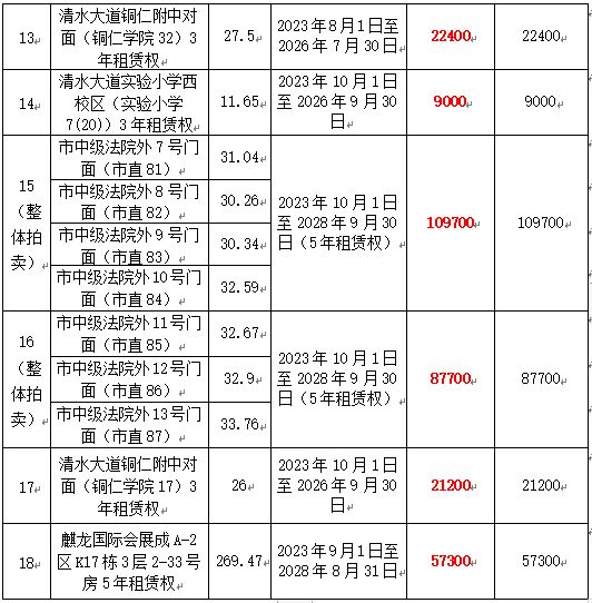 15、市中級法院外7號門面(市直81)、市中級法院外8號門面(市直82)、市中級法院外9號門面(市直83)、市中級法院外10號門面(市直84)5年租賃權(整體拍賣),面積分別為:31.04㎡、30.26㎡、30.34㎡、32.59㎡,租賃期:2023年10月1日至2028年9月30日,起拍價:109700元/年,競租保證金:109700元。(自2026年9月1日起租金按8%逐年遞增)