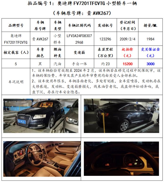 拍品編號1:奧迪牌FV7201TFCVTG小型轎車一輛(車輛原號牌:貴AVK267);