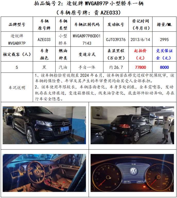 拍品編號2:途銳牌WVGAB97P小型轎車一輛(車輛原號牌:貴AZE033)