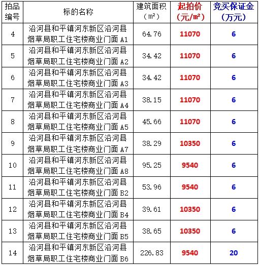 4、沿河縣和平鎮(zhèn)河?xùn)|新區(qū)沿河縣煙草局職工住宅樓商業(yè)門面11間,建筑面積:34.42㎡-226.83㎡,起拍價(jià):9540元/㎡-11070元/㎡,競買保證金:6萬元/間。