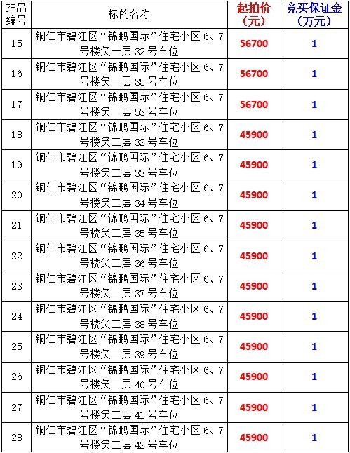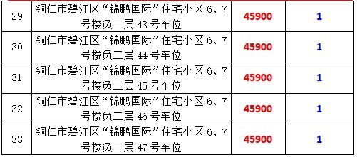 拍品編號15-33:銅仁市碧江區(qū)“錦鵬國際”住宅小區(qū)6、7號樓負(fù)一層:32號、35號、53號,負(fù)二層:32號-47號共計(jì)19個(gè)車位