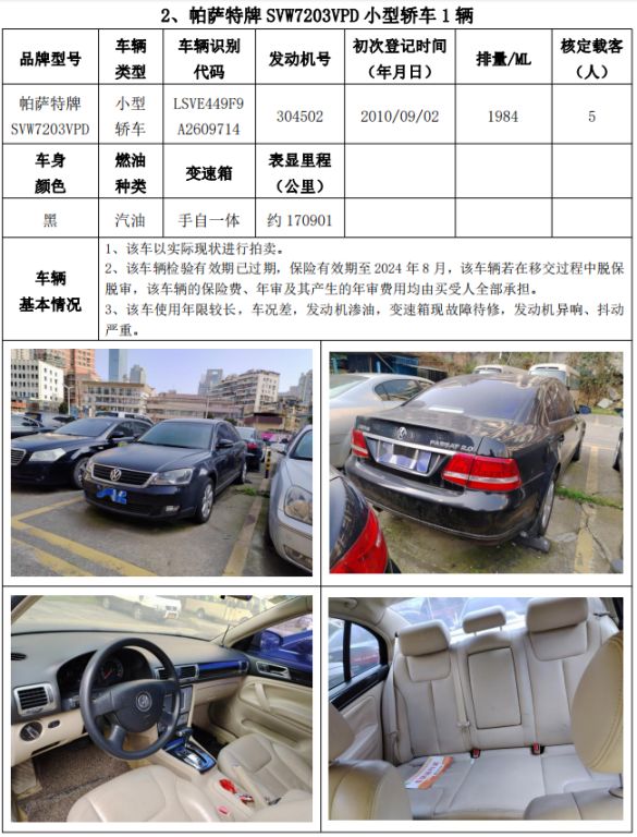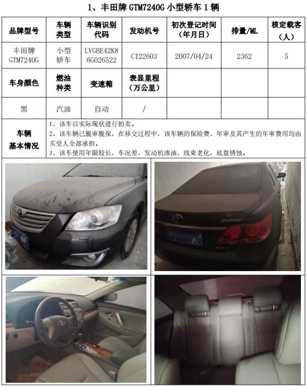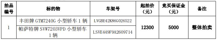 拍品編號1:豐田牌GTM7240G小型轎車1輛、帕薩特牌SVW7203VPD小型轎車1輛,共計(jì)2輛,整體拍賣