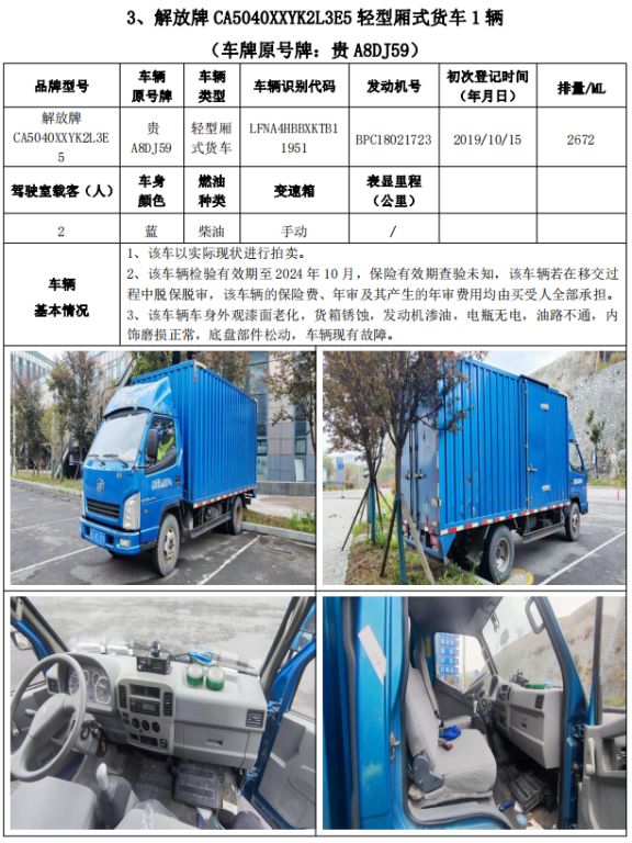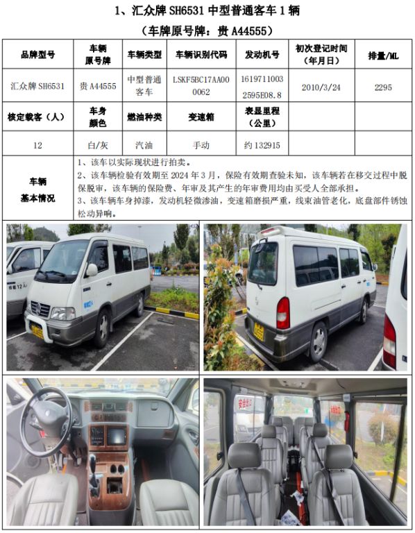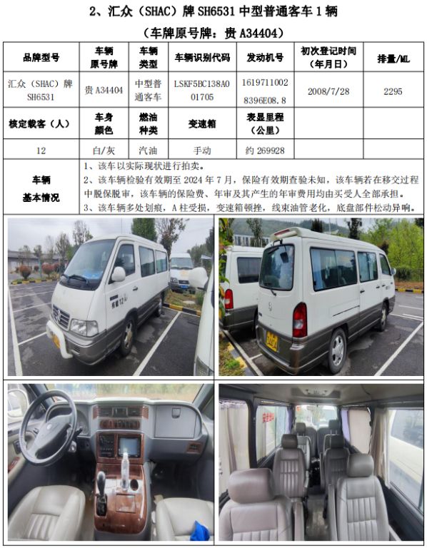拍品編號(hào)1:匯眾牌SH6531中型普通客車、匯眾(SHAC)牌SH6531中型普通客車、解放牌CA5040XXYK2L3E5輕型廂式貨車,共計(jì)3輛,整體拍賣
